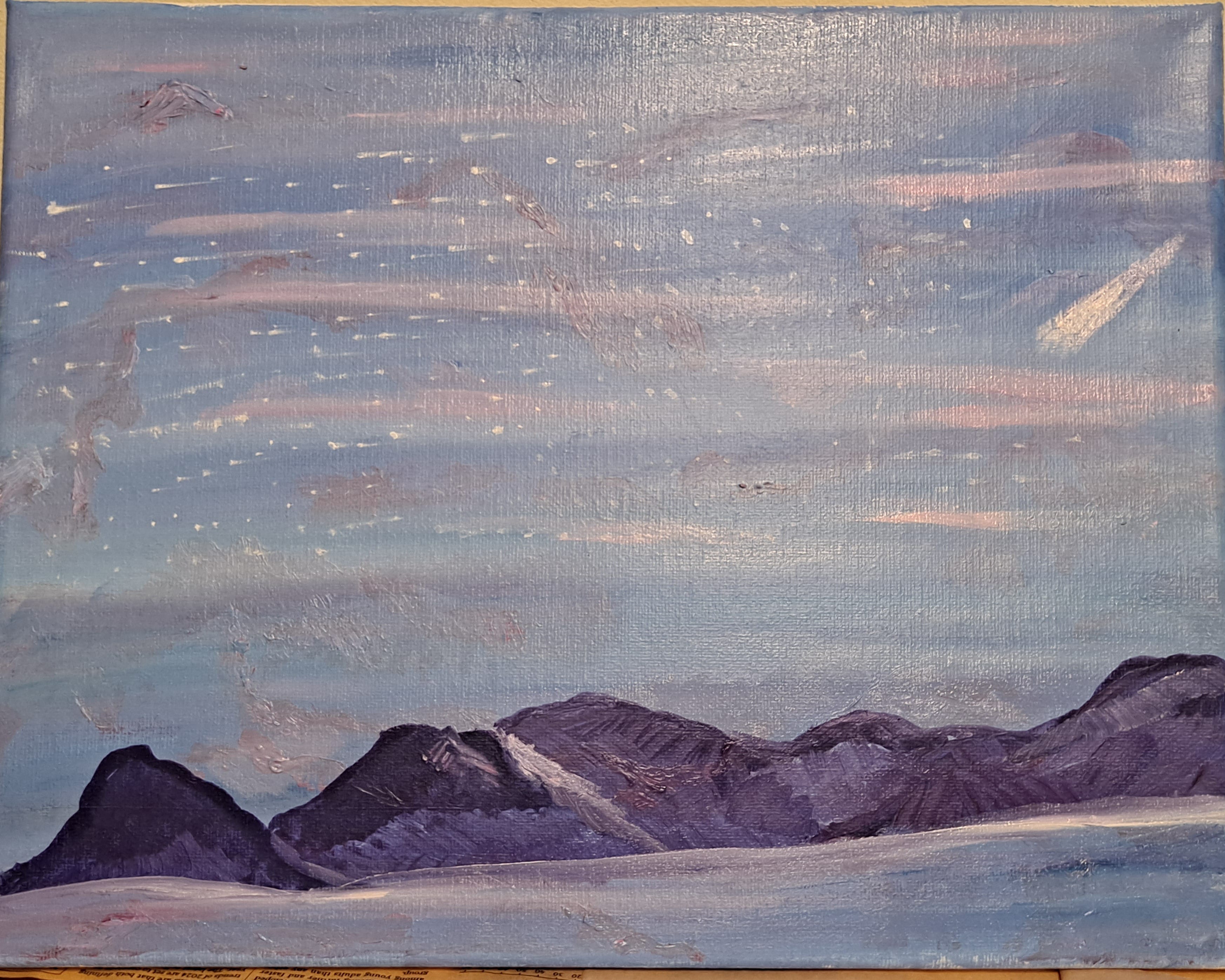 Also this week, I reworked my night-sky clouds and surprised myself; the painting turned out much differently than I ever imagined it. I took an organic approach and just started playing with brushstrokes and colors, and I realized that the Magenta was a bit too strong a color for the dark in an evening sky. I needed to tone it down a notch, and, before I knew it, I was painting mountains in a night landscape with a comet and a swirl of stars. The layer I previously painted adds a nice texture to this draft.