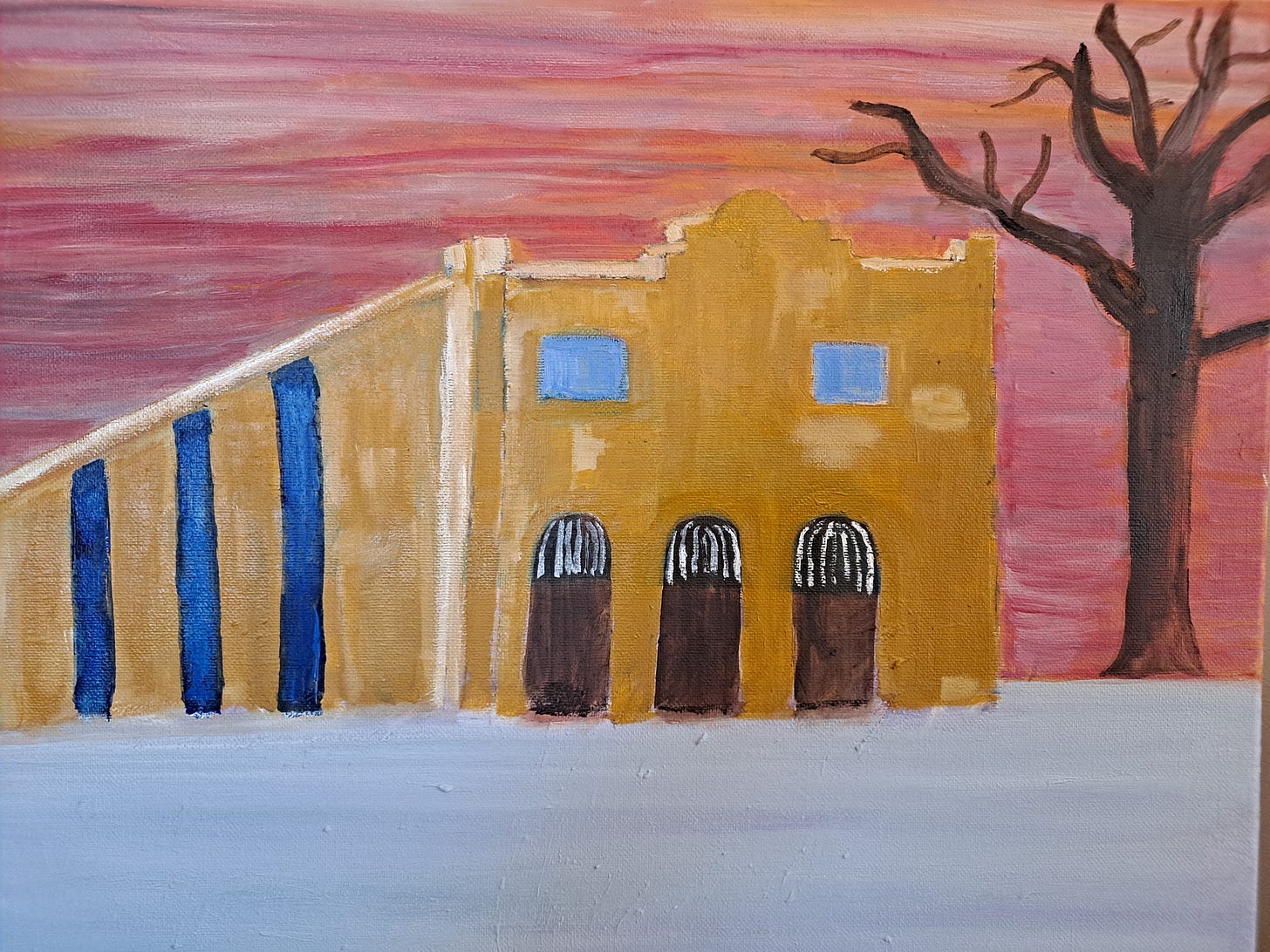 I love the tree! I don’t think it needs anything else, the colors of the sky blended into it are perfect. I agree, no leaves. I also like the way the colors of the sky show on the whitish top of the building.