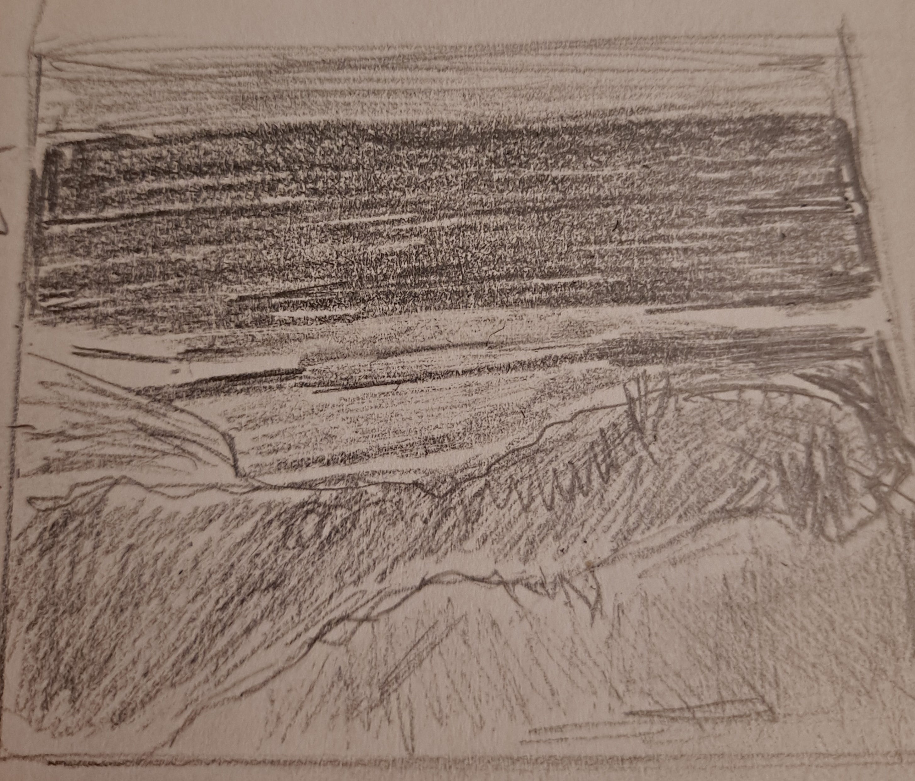 I did the thumbnail sketch with pencil, trying to see the shapes of the landscape and filling in light and dark parts of the shapes:
