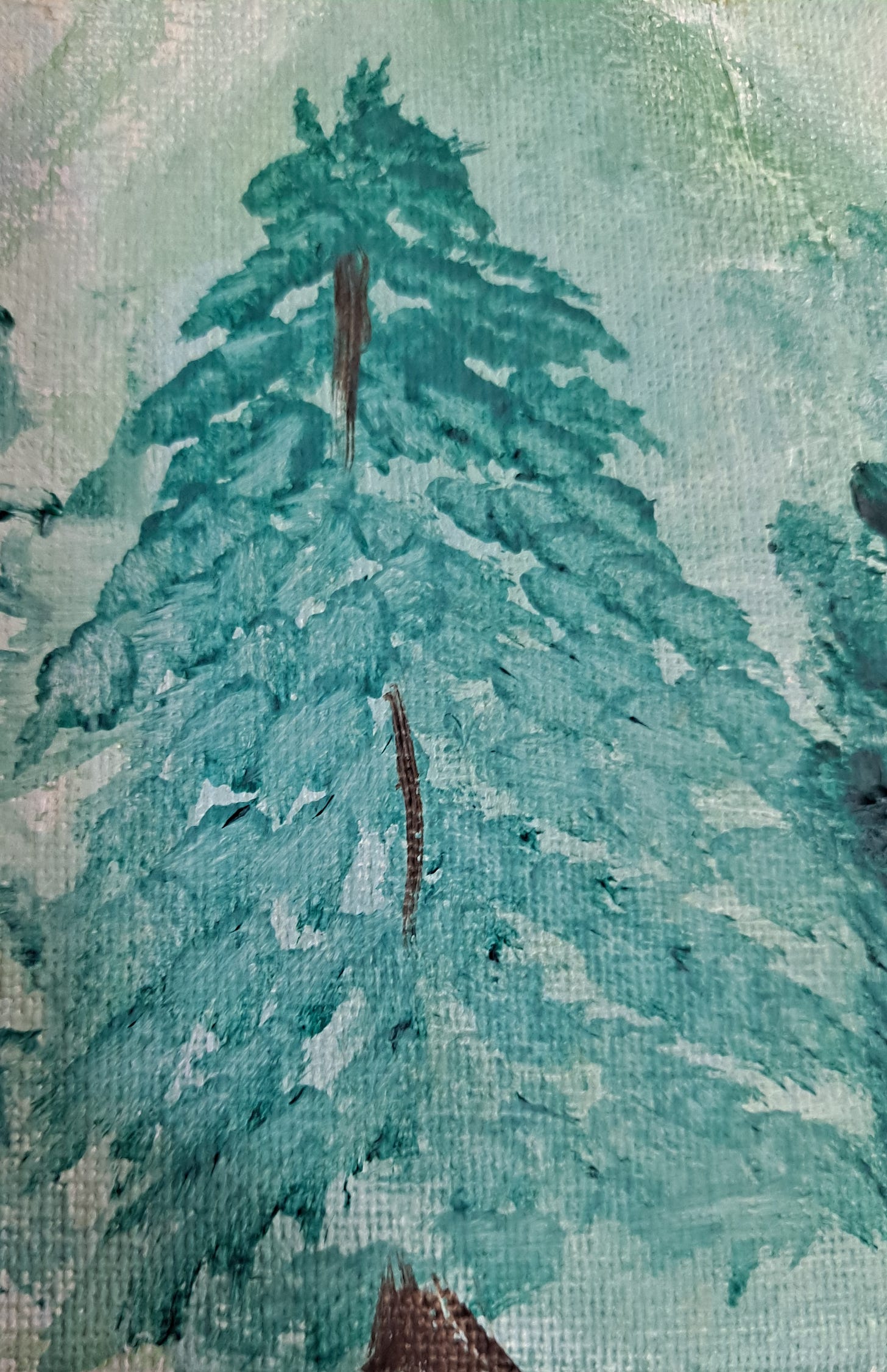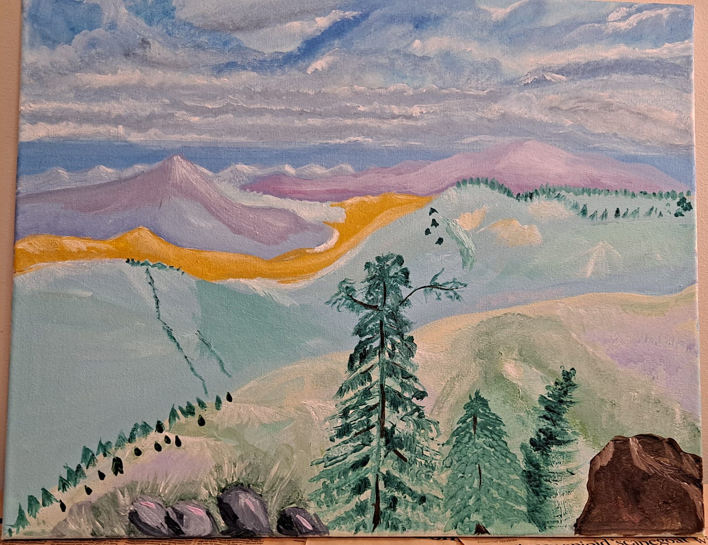 I love that you spent New Year's Eve/Day working on your art, and the additions you made to your mountainscape turned out so well. The trees and rocks really add a lot. My favorite part of this painting might be that brown rock. It's great that you painted it thinking you were covering up a mistake. Maybe that says something about mistakes. Or not. ha. It's interesting how you painted the foilage on the middle tree by dabbing with a paintbrush. The result turned out beautifully, I'd say.