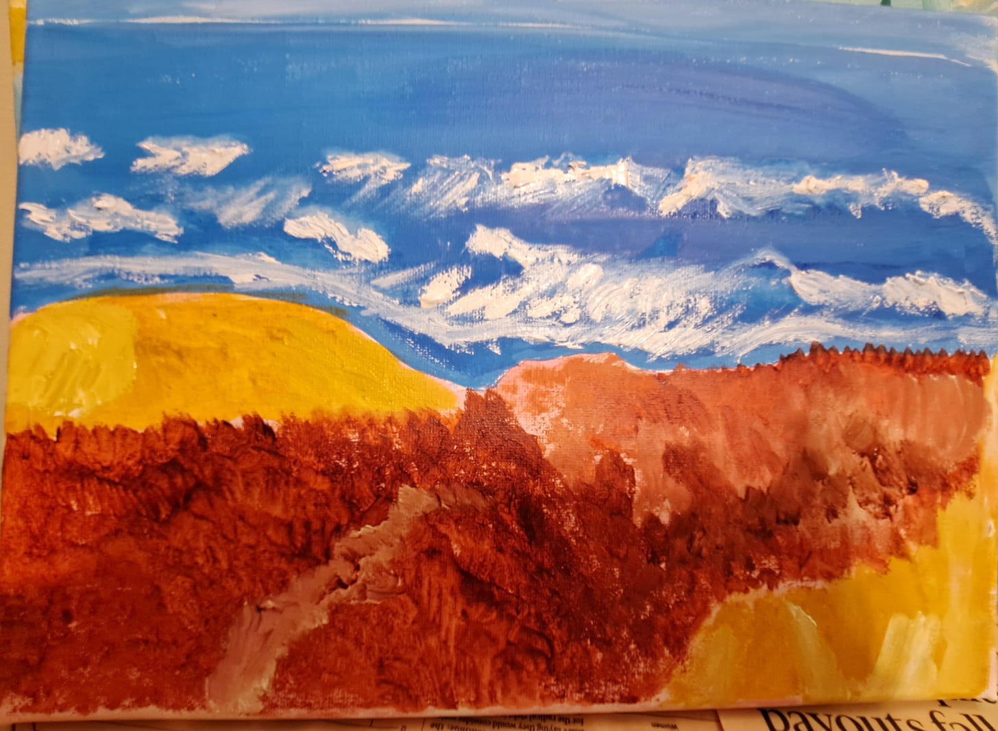 This really came together, Beth! I really like the shading of the background colors, especially how the clouds and purple mountains appear. I can see why you like the Burnt Sienna and it really pops against the shaded yellow. Explaining the process, too really helped us to see how you got there. It seemed quite intimidating! I'm glad you stepped in and blended some of your processes as well. This was a treat to watch and so appreciate you sharing. (I would expect those trees to be waving on mountaintops!) Beautiful job and happy 2026 to you, Beth!
