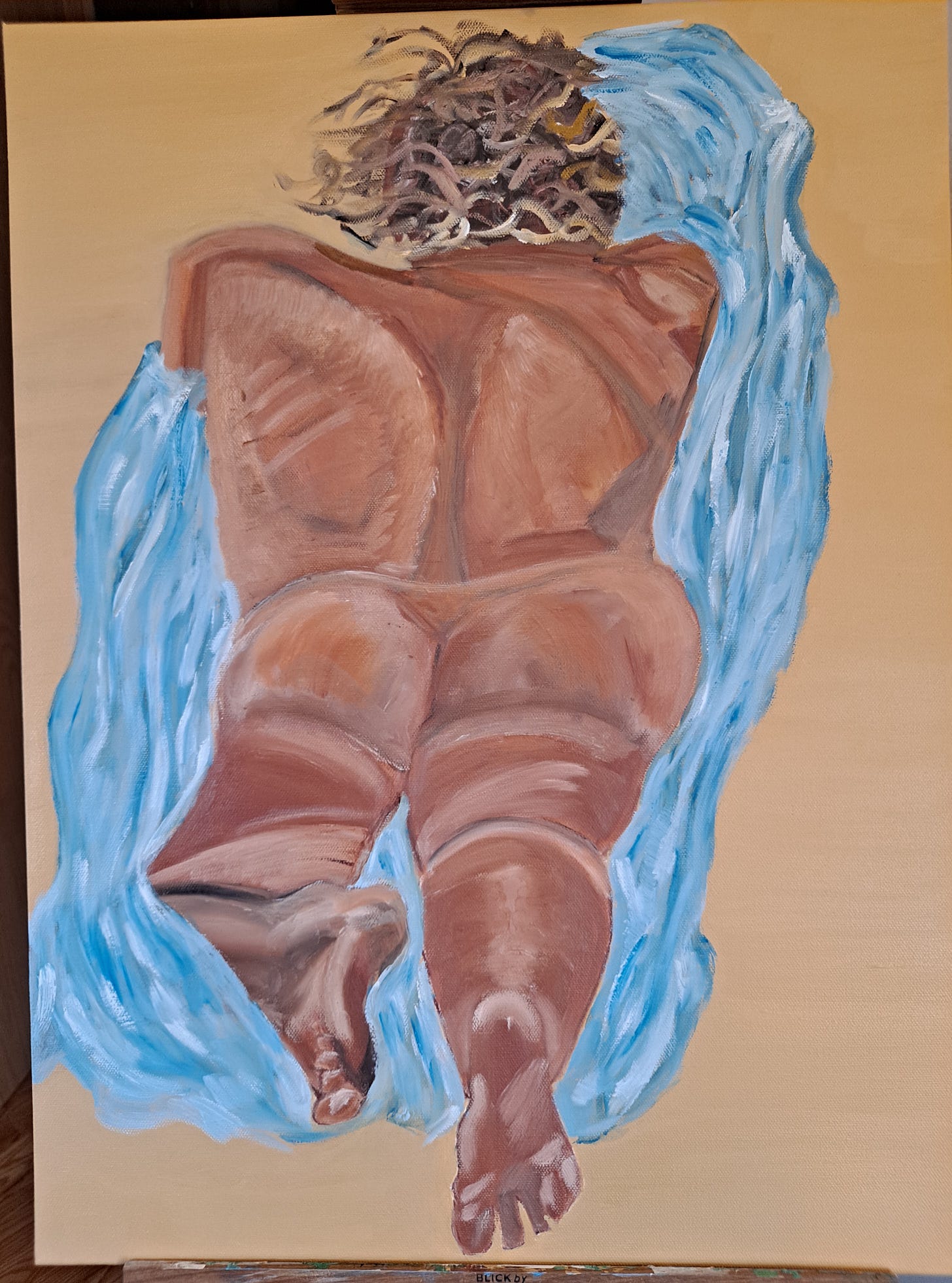 While I worked on the figure itself, most of my work involved the blue blanket that the woman is laying on. As I’ve said before, I struggle illustrating fabric in a painting. While I wasn’t aiming for photorealism, I was hoping for the blanket to turn out better. I reworked the blanket around the nude’s arms to indicate that her arms are hidden within it.