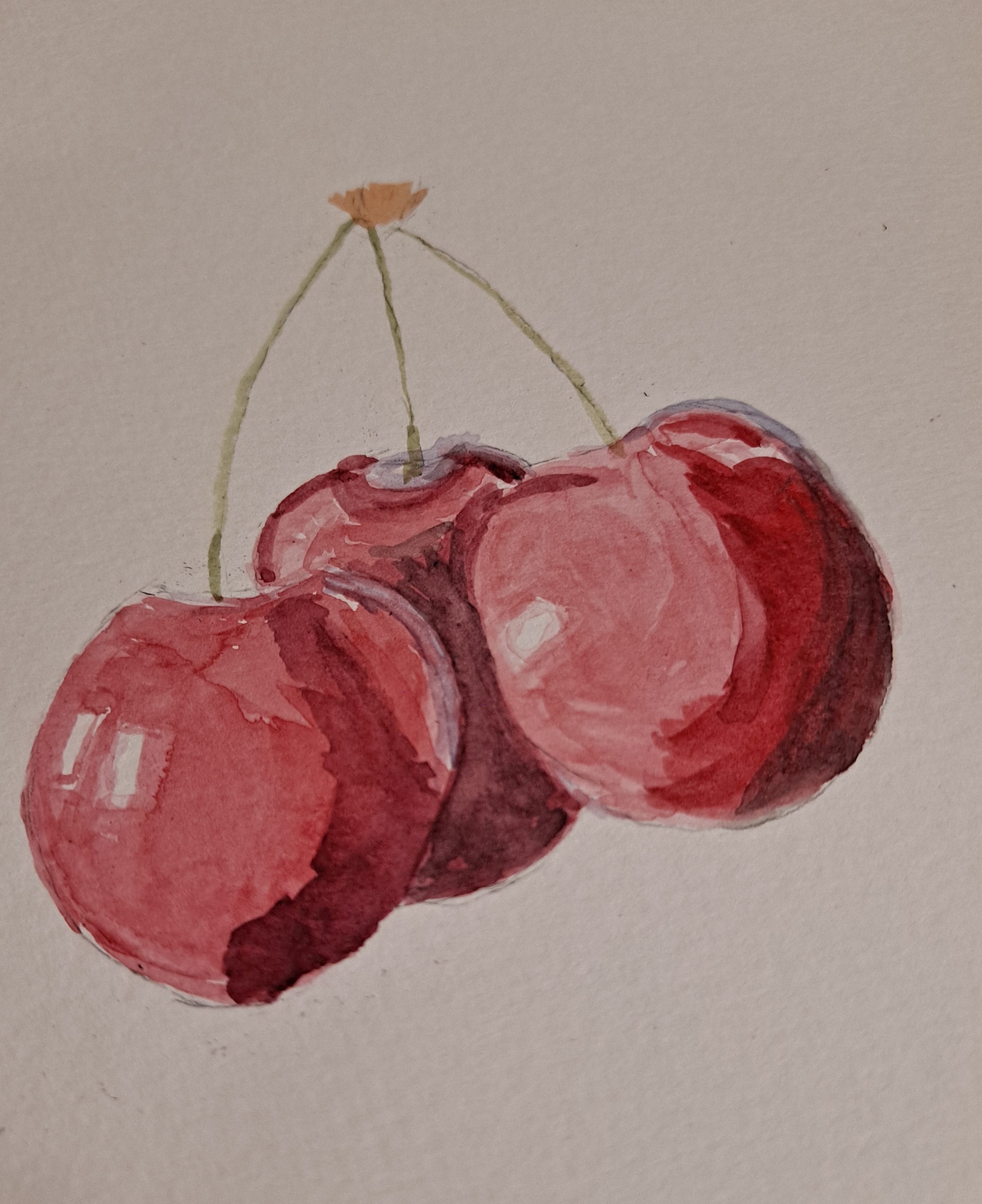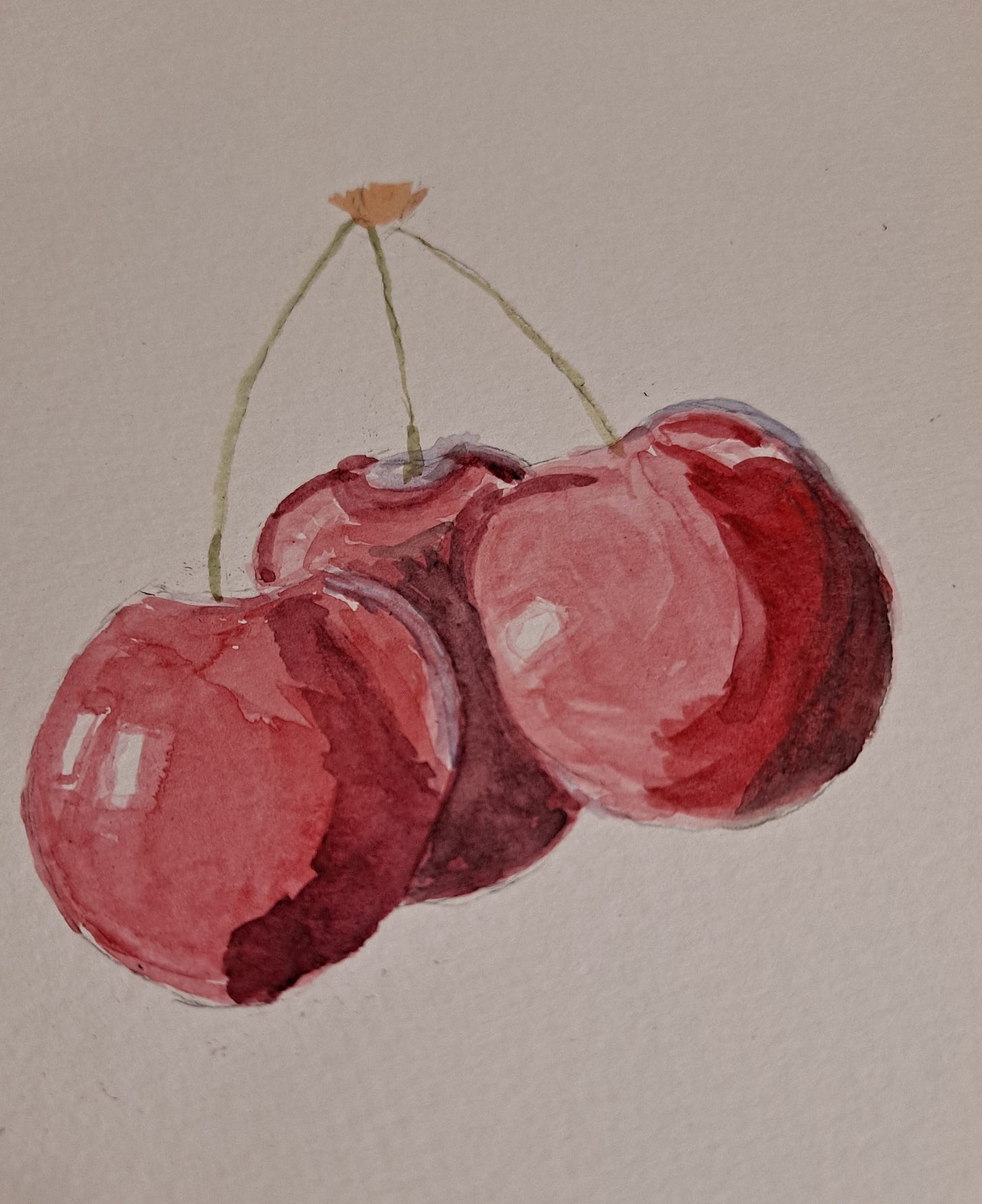 This week I realized that I needed to get out of my comfort zone artwise. Having oil painted for over 20 years, this kind of art is most familiar to me. However, I decided that I should do a watercolor exercise this week, and chose cherries (below) as my subject. Last time I watercolored, I created grapes and now cherries. It’s not because I favor fruit as my subject, but I’m still struggling with watercolor flowers and entire landscapes. One of these days, after a few deep breaths, I will attempt a watercolor landscape.