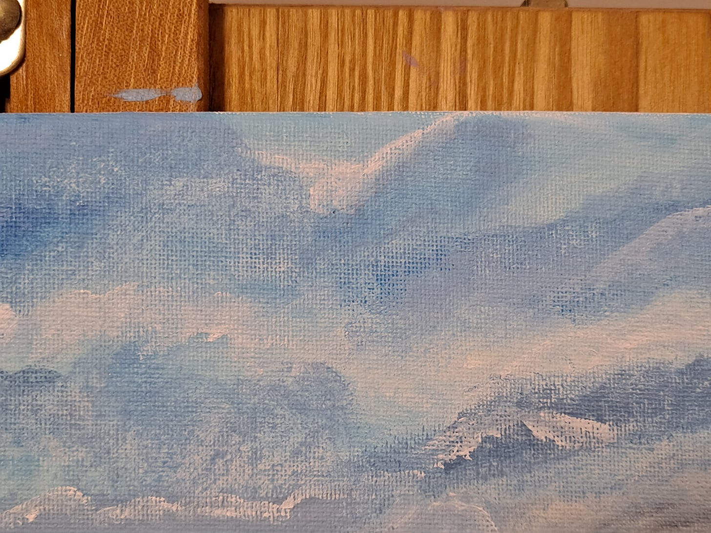 While skies are challenging for me, I reflected as I painted this one, how much I love working on skies. While it’s tempting to add more touches or make changes to this one, I don’t want to overwork it, so I’m leaving it as is. And a happy accident occurred when I added a touch of white to a certain cloud: