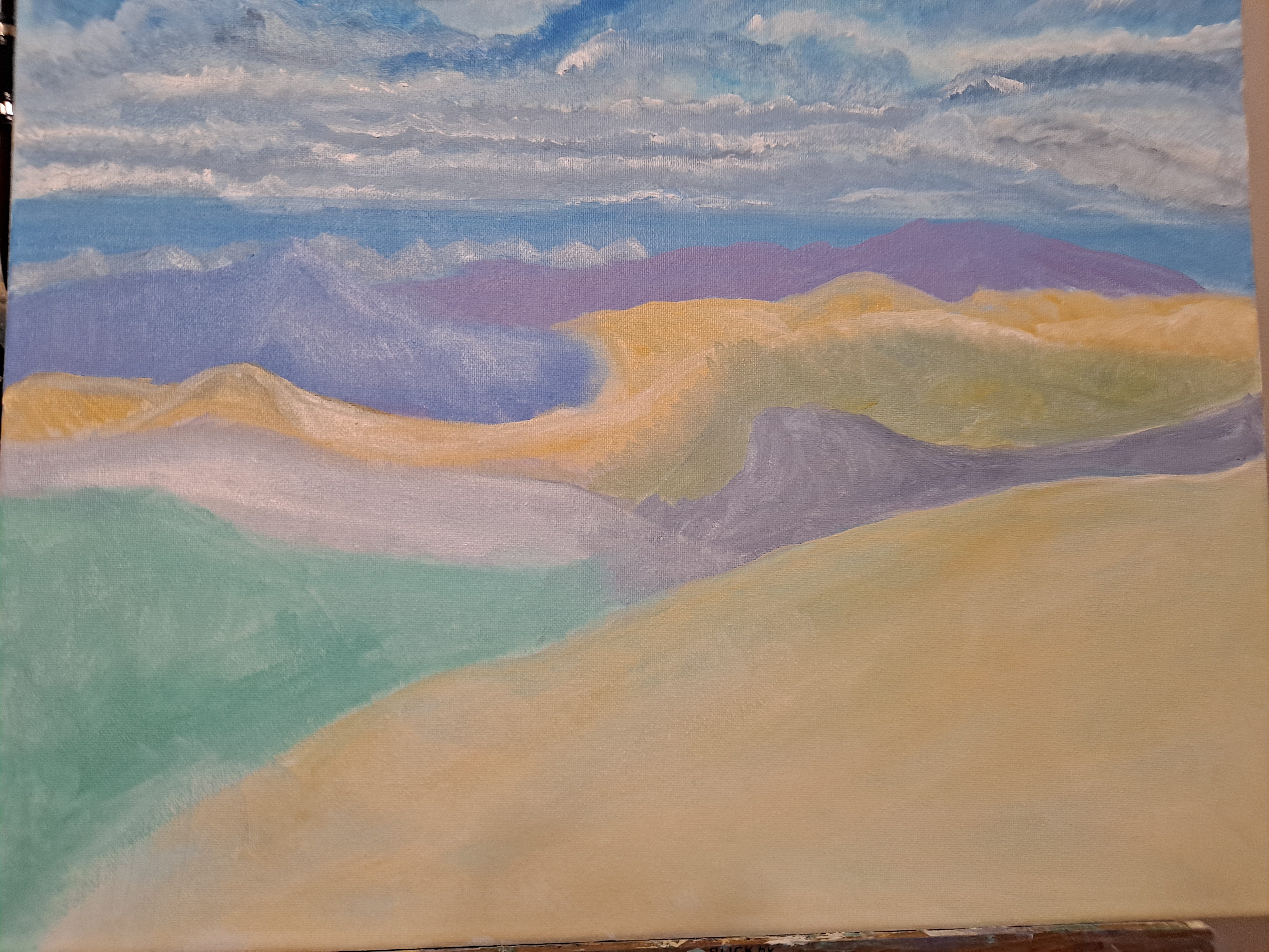 The rest of the landscape is less developed than the sky. Right now, the main thing I must re-learn is patience: that at this point in time, the mountains are just swaths of color that will most likely serve as the underpainting for what will be on top of them. I see opportunities for changes in mountain color and working on textured paintstrokes. Eventually, I will be adding trees and perhaps other foliage in the foreground.