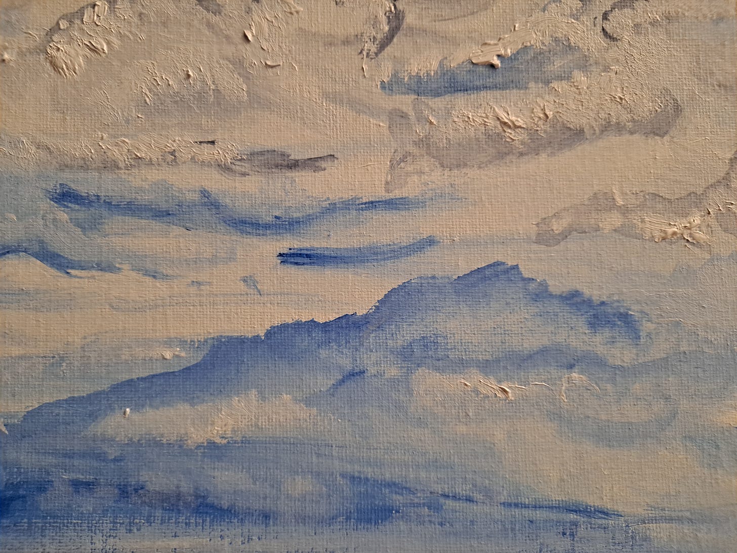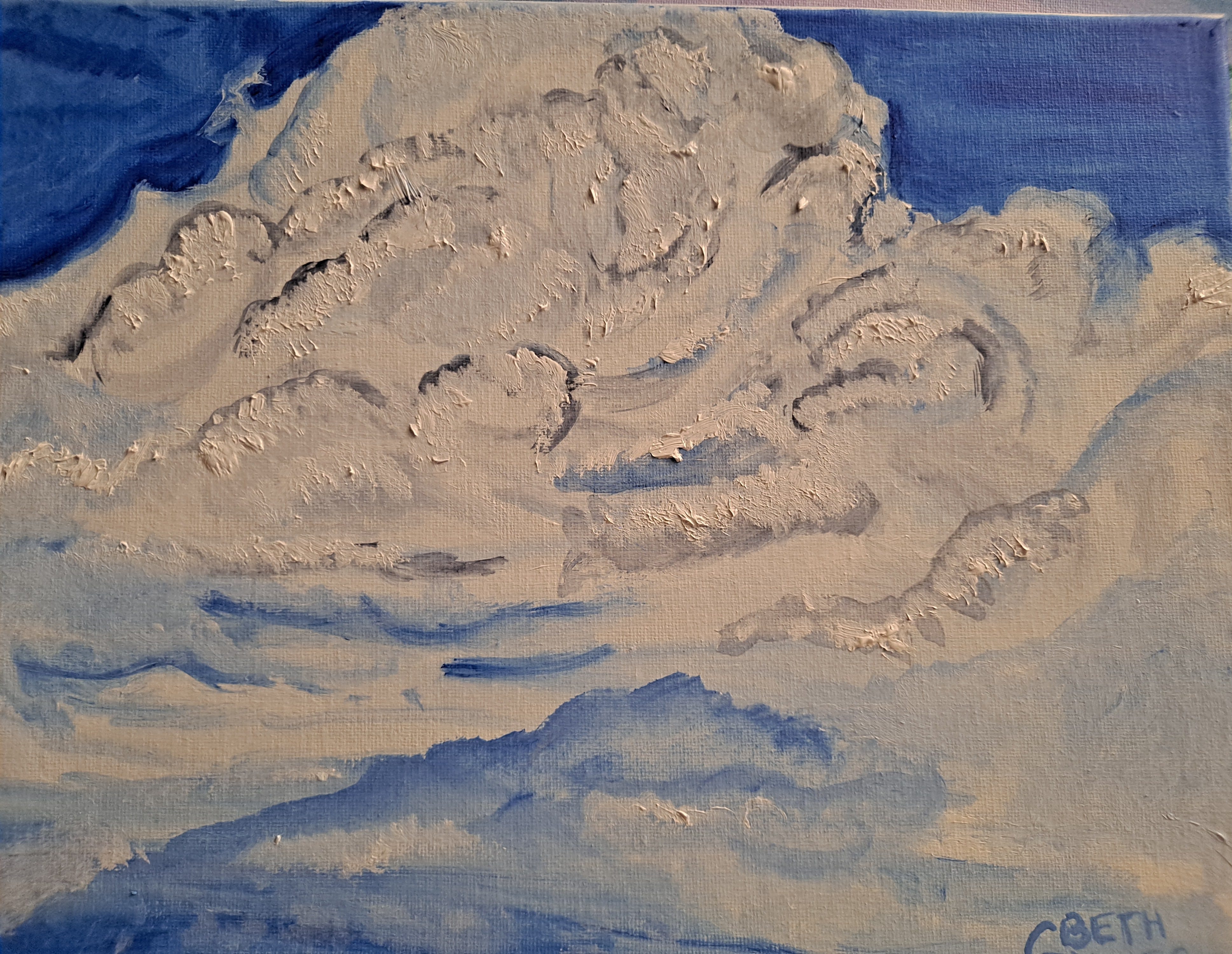 Last week, I started painting a cloud, and this week I had two surprises: I completed the painting rather quickly and signed it (see below), and a happy accident occurred (see last photo). I used thicker globs of paint on this artwork than I usually do.